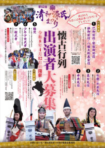 「第61回 清和源氏まつり」出店者の募集を開始!! まつり当日の出店および出演者の募集を開始いたしました。 詳細は、下記ボタン像をクリックしてご確認ください。清和源氏まつりを一緒に盛り上げていただける方のご応募お待ちしております。 出店募集要項ページへ ご案内 「第61回 清和源氏まつり」へのご協賛のお願い 清和源氏まつりの懐古行列出演者稚児役・少年少女武者・一般武者募集開始 関連記事 懐古行列に出演する出演者を募集 2025年11月25日 当日の交通規制について 2025年3月25日 清和源氏まつりの懐古行列出演者稚児役・少年少女武者・一般武者募集開始 2025年1月31日 「第61回 清和源氏まつり」へのご協賛のお願い 2025年1月10日 懐古行列の出演者募集 2024年2月2日 出店および出演者の募集開始 2023年12月18日
